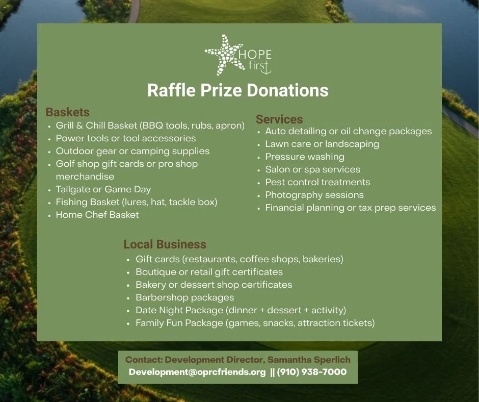 Any question? Contact Development Director, Samantha Sperlich at Devlopment@oprcfriends.org or (910) 938-7000.